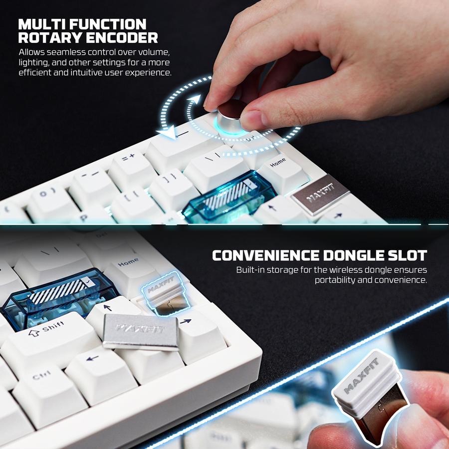 SPEC* Full key anti ghosting* Cherry profile PBT double-shot keycaps* Multi function rotary encoder* Up to 200 hours of battery life* South-facing hot-swappable switches; White switch (soft linear keys) and Brown switch (tactile quite keys)* 3 Mode connection; Wired, 2.4Ghz StrikeSpeed Wireless, Bluetooth version 5.3* ARGB Lighting, 46 modes* QMK Firmware/VIA Compability* Convenience dongle slot* Gasket mount* Translucent polycarbonate accent keys* Windows & macos ready* Adjustable feet* USB-C Charging port* Battery 3.000 mAh lipo* Easy to switch* Cable Length 1.6m nylon braided